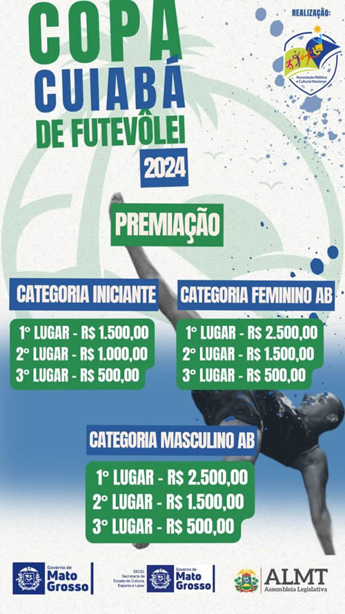 A programação da etapa regional da Copa Cuiabá de Futvôlei começa às 9h de sábado com a disputa da categoria iniciante. Às 15h, iniciam-se os duelos masculinos e, em seguida, as disputas femininas. A programação é a mesma para o domingo, no Parque das Águas, em frente à Assembleia Legislativa de Mato Grosso. A competição é organizada pela Associação Atlética Cultural e Nacional de Mato Grosso, com patrocínio do Governo do Estado através da Secel/MT.