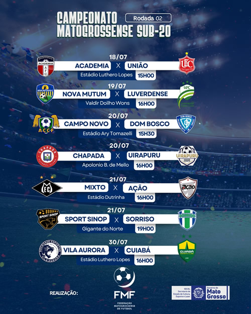 A segunda rodada do Campeonato Mato-grossense Sub-20 de 2025 será realizada entre os dias 18 e 30 de julho, com sete confrontos programados em várias cidades do estado. A competição, promovida pela Federação Mato-grossense de Futebol (FMF) e com apoio da SECEL-MT, segue como um espaço estratégico para revelar jovens talentos das categorias de base.