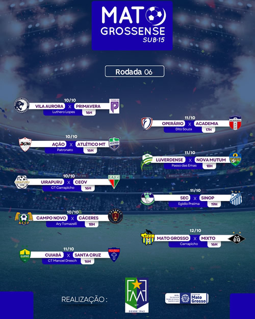 A 6ª rodada do Campeonato Mato-grossense Sub-15 2025 terá início nesta sexta-feira (10), movimentando os gramados com partidas que podem definir os rumos da competição. A disputa é organizada pela Federação Matogrossense de Futebol (FMF), com o apoio da Secretaria de Estado de Cultura, Esporte e Lazer (Secel-MT).
