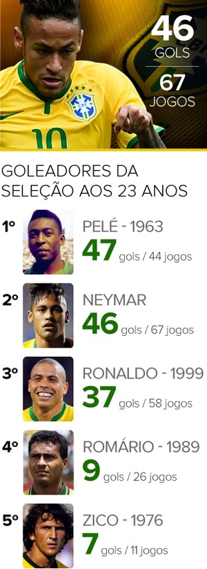 Analisando os números atuais, Neymar é o quinto maior goleador da história da Seleção, atrás apenas de Ronaldo (67 gols), Zico (66) e Romário (56). Os três, com menos partidas do que o atual camisa 10 e Pelé, estão longe da marcas dos compatriotas com 23 anos.