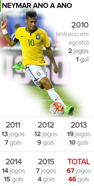 Outra marca que Neymar deve atingir é a de ser o maior artilheiro da história da seleção brasileira. Pelé lidera a lista com 95 gols. O GloboEsporte.com fez uma projeção com os números atuais do craque. Desde que estreou com a amarelinha, em 2010, o jogador tem média de 11 partidas por ano, com 7,48 gols por temporada. Caso mantenha tais estatísticas pela equipe nacional, o atual camisa 10 do Brasil ultrapassará o Rei em 2021, com 29 anos.