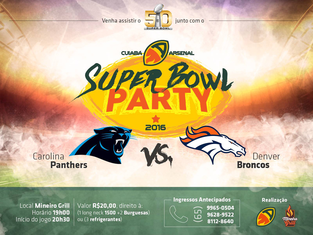 Carolina Panthers e Denver Broncos se confrontam na 50ª edição do Super Bowl, a grande final do campeonato da National Football League (NFL), no Levi´s Stadium, na cidade de Santa Clara, na Califórnia (EUA). E o Cuiabá Arsenal chama os torcedores para assistir juntos a transmissão pela ESPN, no dia 7 de fevereiro, a partir das 19h, no restaurante e churrascaria Mineiro Grill, em Cuiabá. Com ingresso ao custo de R$ 20,00 com direito a kit de comes e bebes.