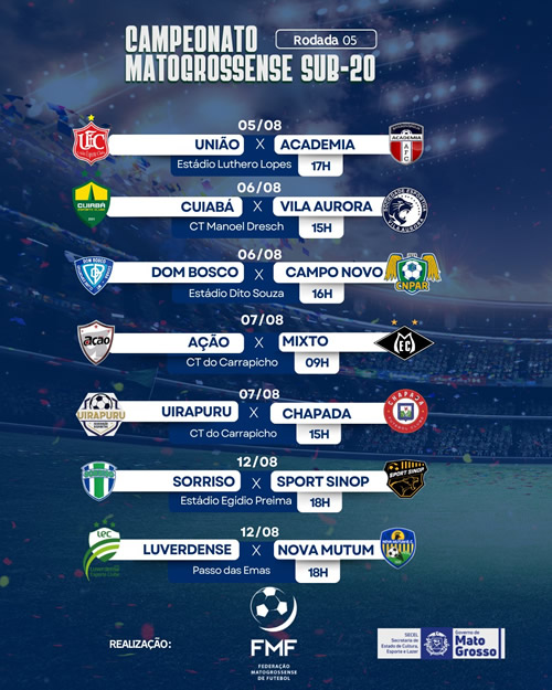 A quinta rodada do Campeonato Mato-grossense Sub-20 2025 promete fortes emoções e será realizada entre os dias 5 e 12 de agosto. A competição, organizada pela Federação Matogrossense de Futebol (FMF) com apoio da Secretaria de Estado de Cultura, Esporte e Lazer (SECEL-MT), segue revelando talentos e aquecendo os gramados por todo o estado.