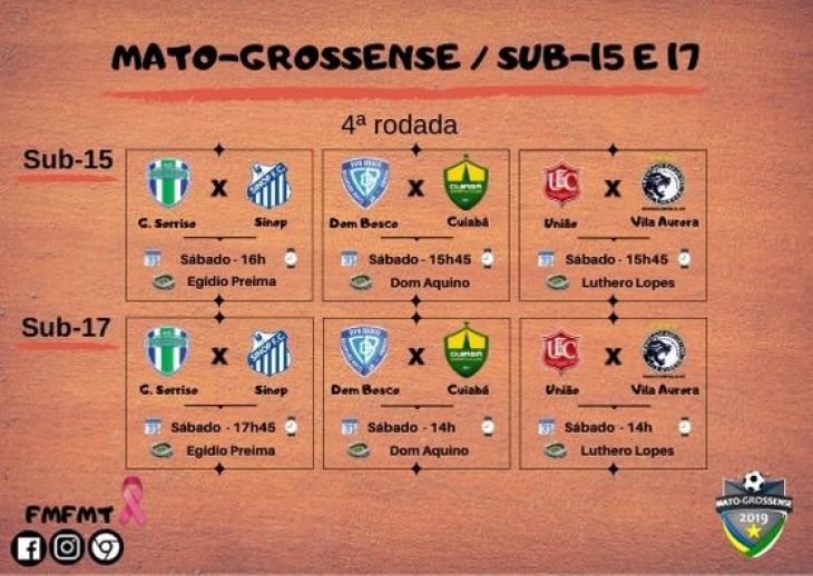 25/10/2019 - Mato-grossense Sub-15 e 17: 4ª rodada acontece neste sábado Seis jogos movimentam a 4ª rodada do Campeonato Mato-grossense Sub-15 e 17 neste sábado. Destaque vai para a estreias de União e Vila Aurora que se enfrentam em Rondonópolis revivendo um dos maiores clássico do estado.