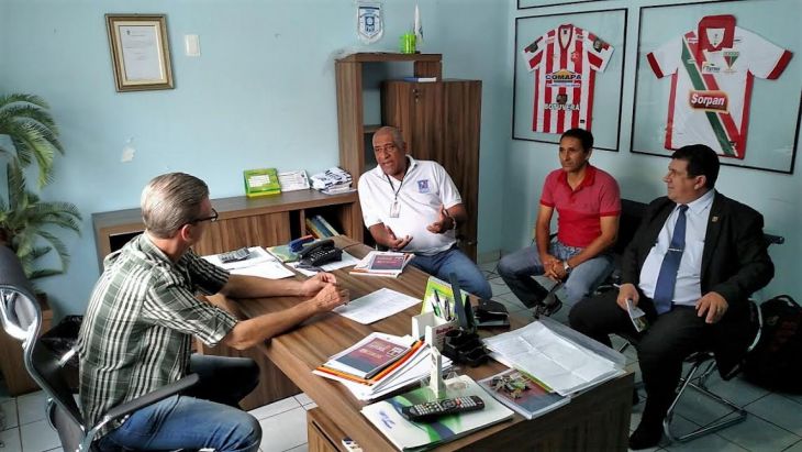 O presidente da Federação Matogrossense de Futebol, Aron Dresch, recebeu nesta quarta-feira (31), na sede da entidade árbitros e assessores mato-grossenses, presidente do sindicato dos árbitros de São Paulo, Arthur Alves Júnior, acompanhados do presidente da comissão de arbitragem do Mato Grosso, Cel. Magalhães. |