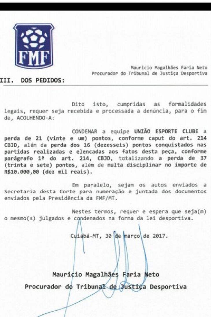 - Procuradoria do TJD pede perda de 37 pontos ao União