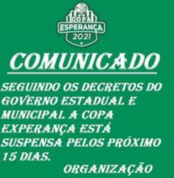 Seguindo os decretos Estadual e Municipal a Copa Esperança está suspensa por 15 dias aguardem mais informações
